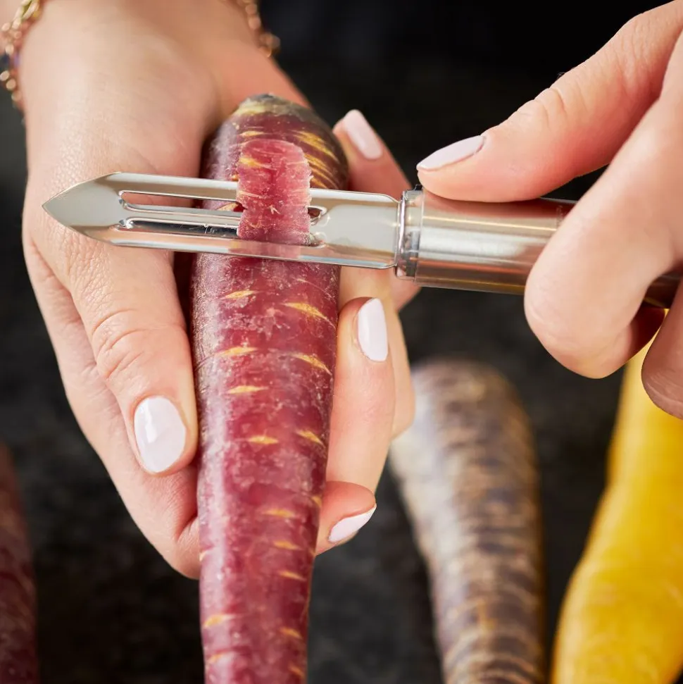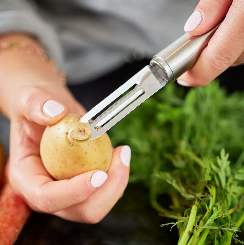 Het stijve scherpe mes over de smalle opening maakt het verwijderen van dunne lagen van groente of fruit een gemakkelijke taak. De scherpe punt van het gereedschap is handig voor het snel verwijderen van vlekken. Geschikt voor zowel rechts- als linkshandig gebruik en werkt in beide richtingen.