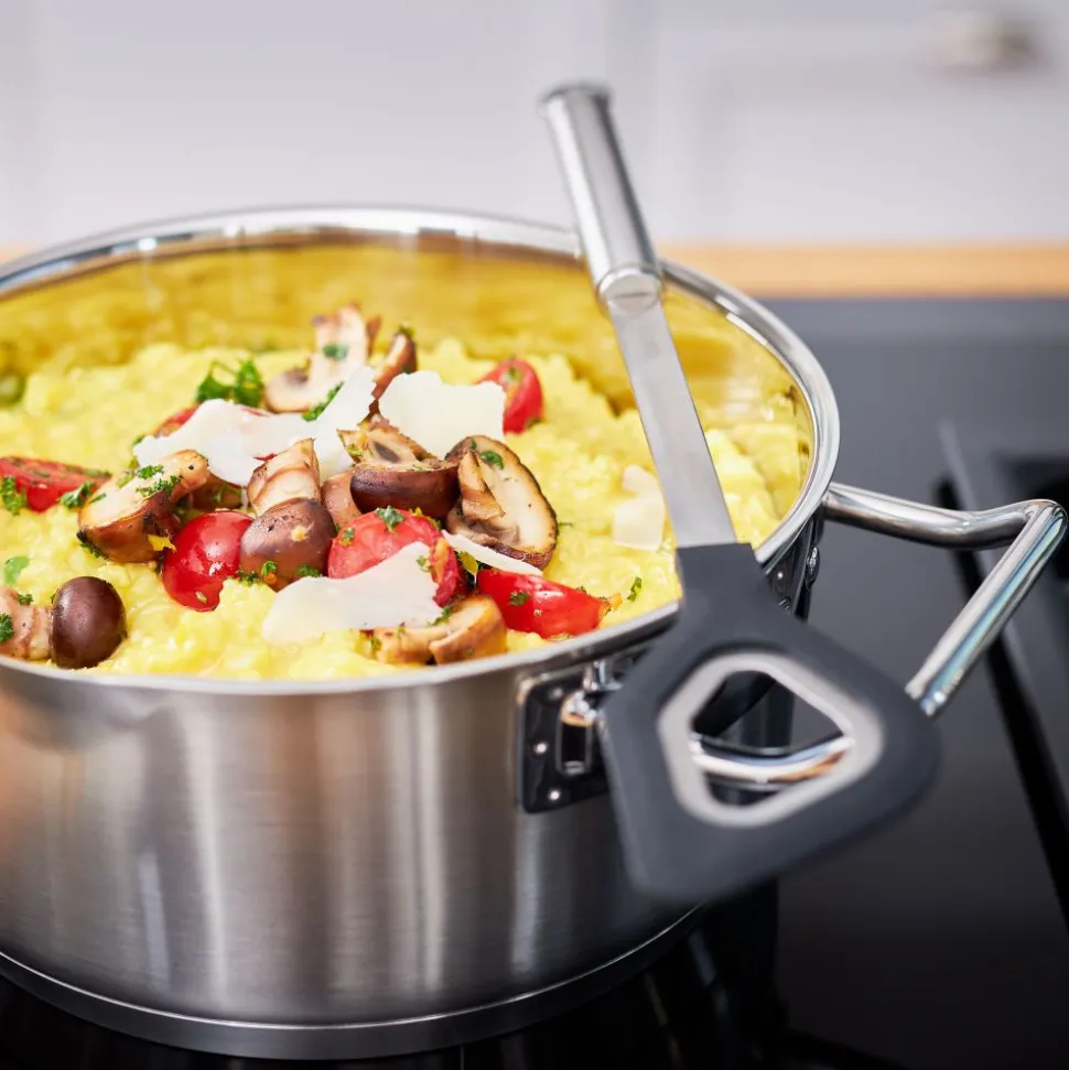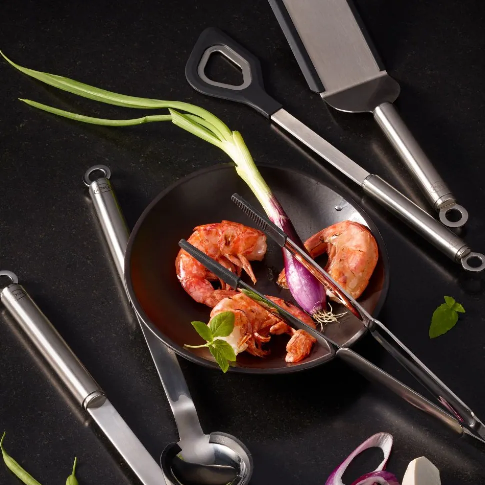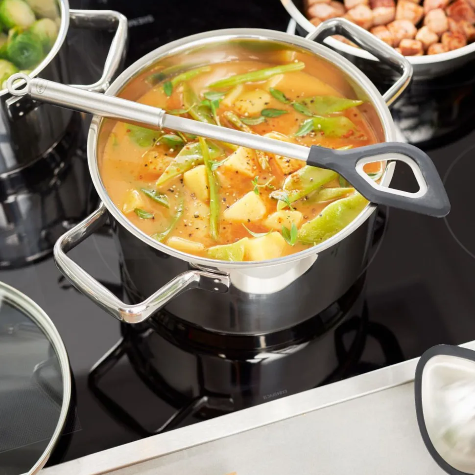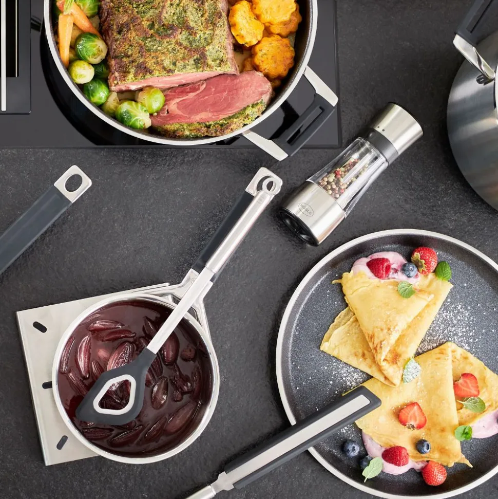 Voor mengen en vouwen. Ideaal voor gebruik in gecoate pannen. Hittebestendig tot 220 °C/428 °F. Vaatwasserbestendig. Duurzame verbinding van roestvrij staal en siliconen.