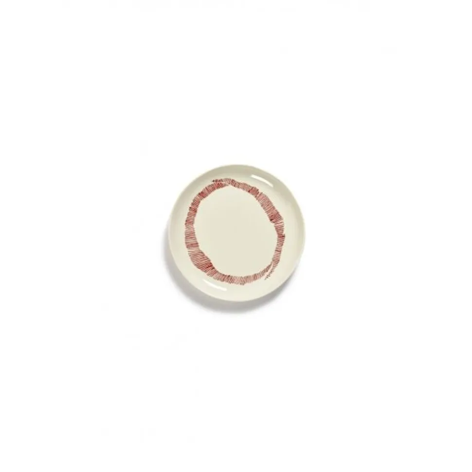 Dit witte designbord van steengoed afgewerkt met rode organische penseelstroken, tilt het dagdagelijkse naar een hoger niveau. Het brengt vreugde en is een perfect voorbeeld van waar de Feast collectie voor staat.