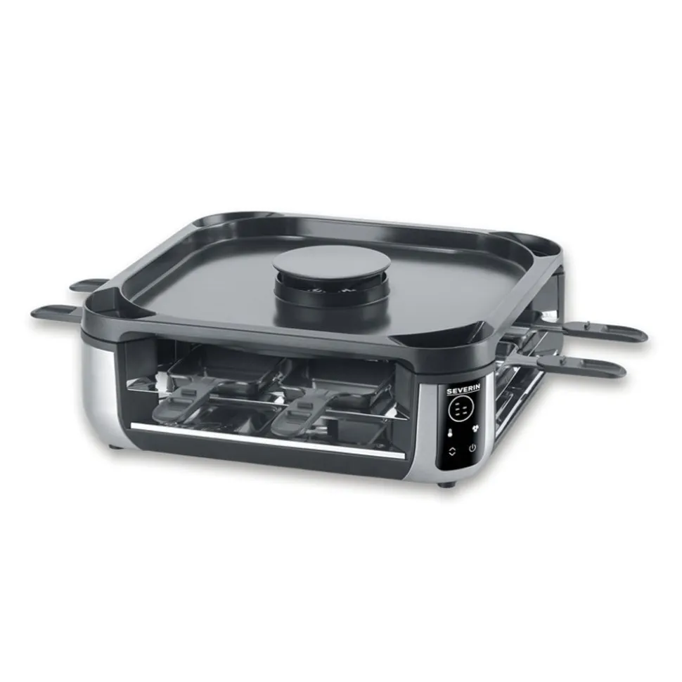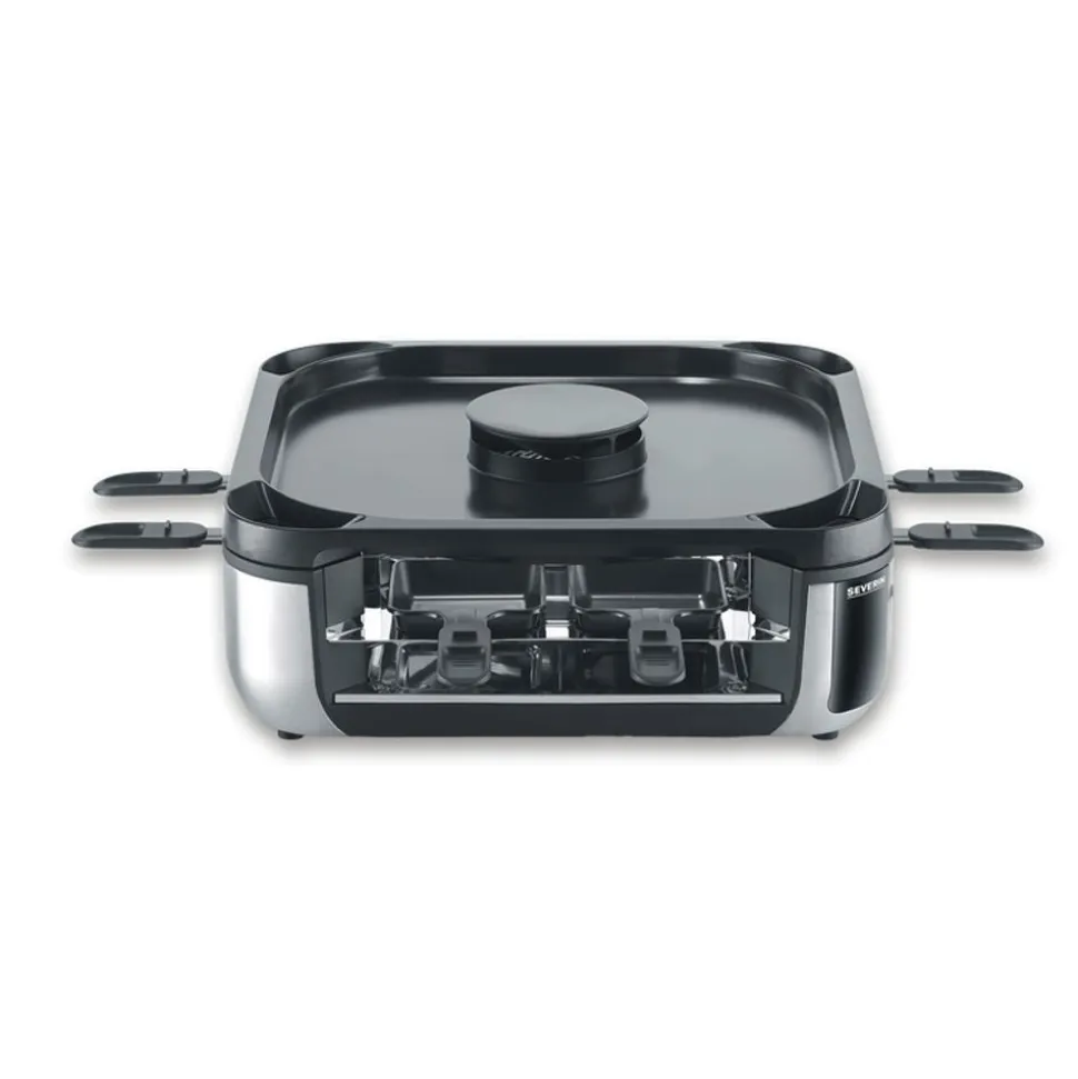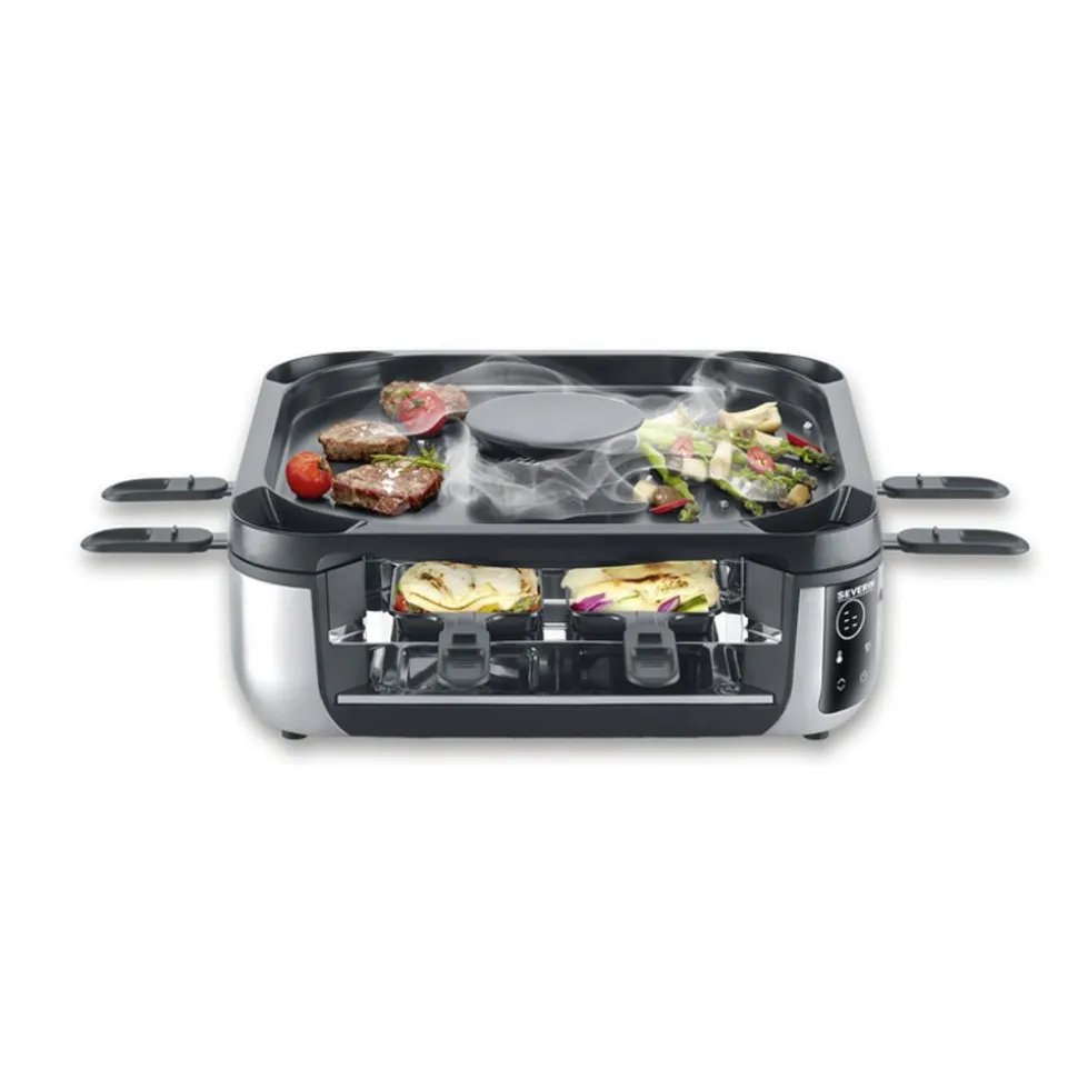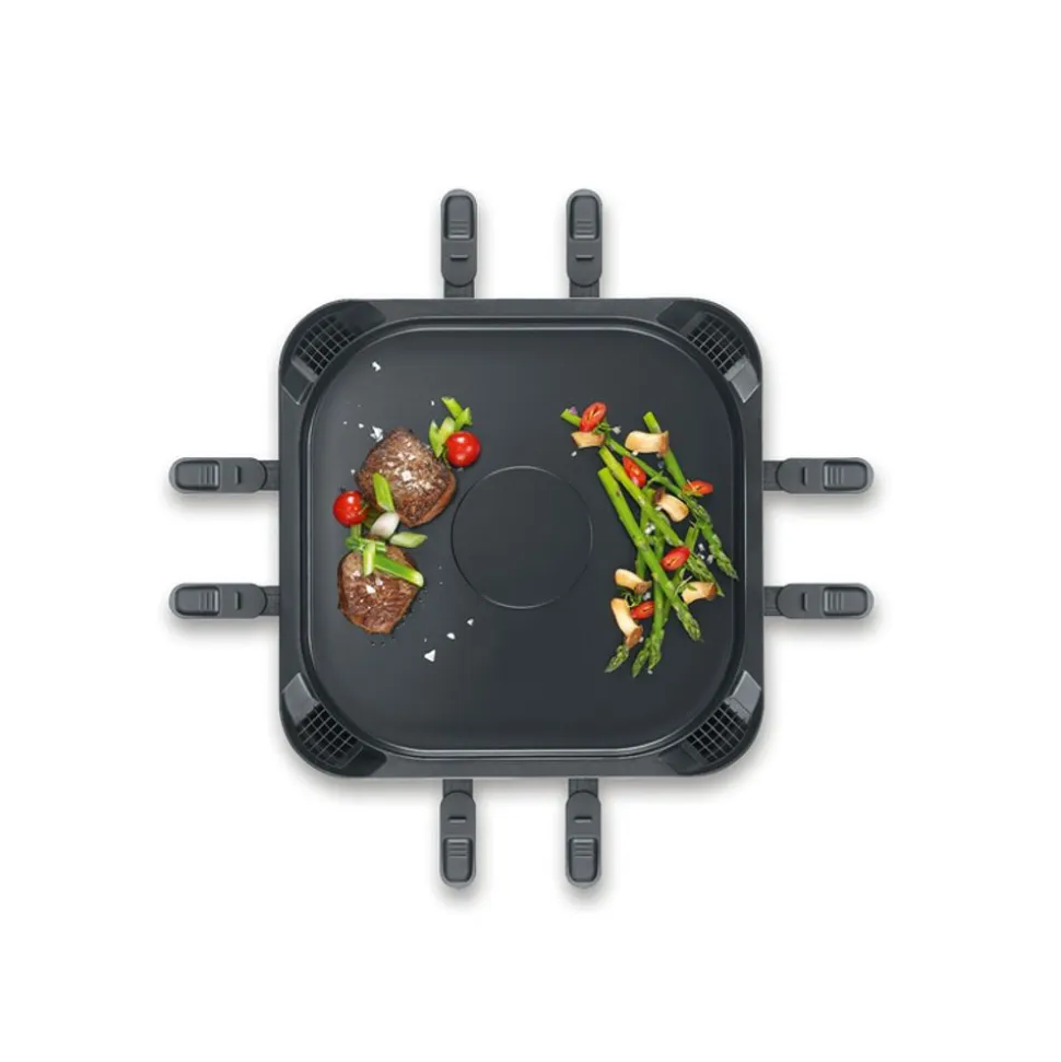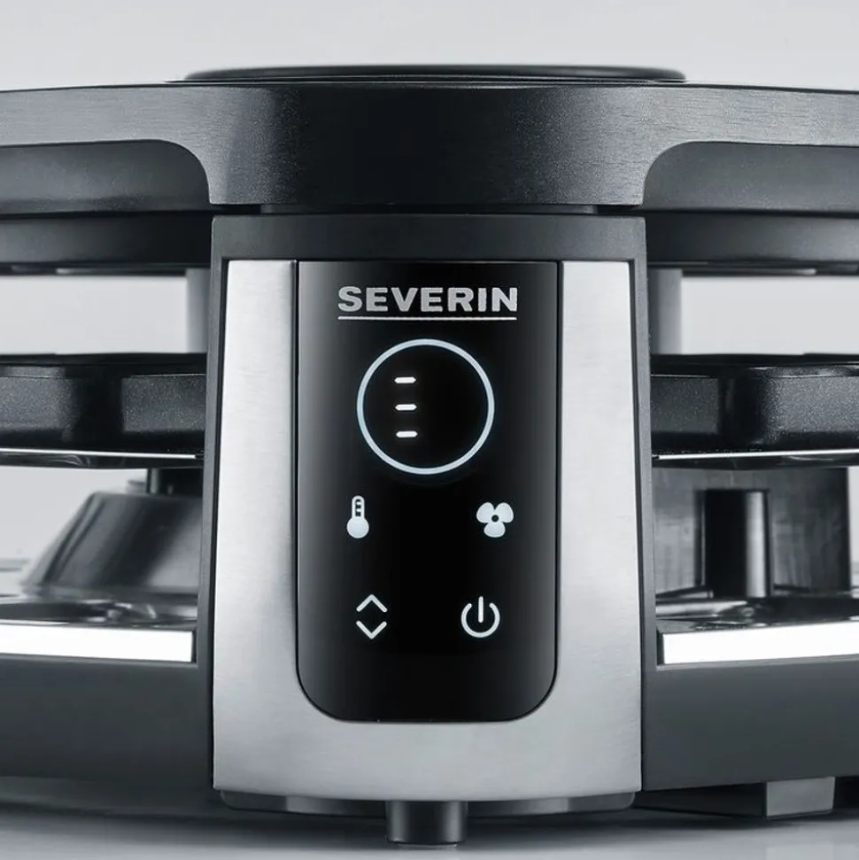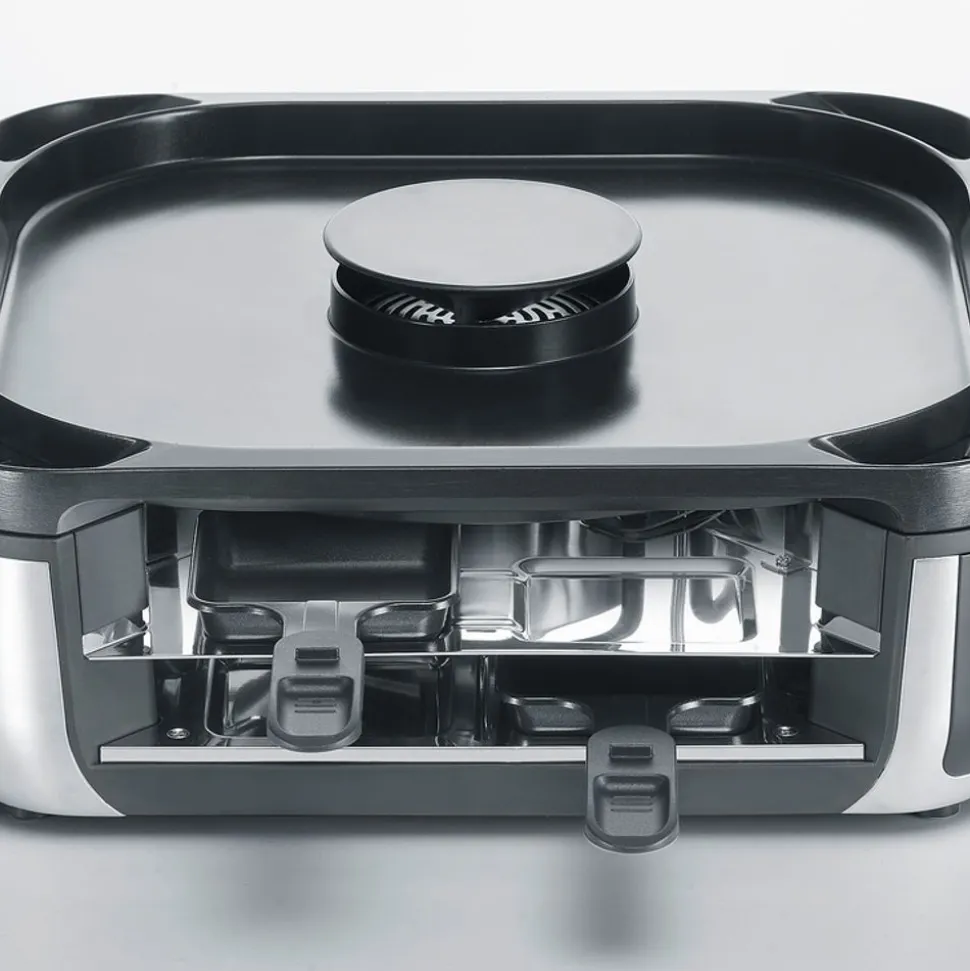 SEVENTO raclette met rookreductie RG 2379 – ’s Werelds eerste raclette met innovatieve downdraft-technologie voor ontspannen raclette-avonden zonder geurtjes of rook. De grillplaat (30 x 30 cm) is voorzien van een hoogwaardige ILAG coating en zorgt zo voor krasvrij en gezond raclettegenot. Het LED-display kan eenvoudig met één druk op de knop worden bediend om zowel de temperatuur als het filtervermogen in te stellen. Het gourmetstel heeft ruimte voor 8 pannetjes, die aan alle vier de kanten van de behuizing gebruikt kunnen worden. De grillplaat en pannetjes zijn vaatwasmachinebestendig.