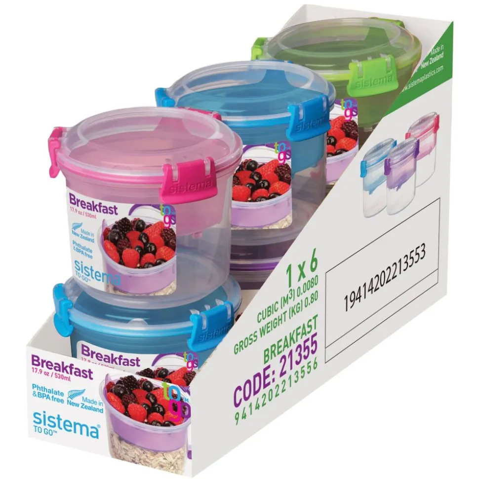 Maak het ontbijt gemakkelijk met de Sistema® Breakfast To Go™. Vul het onderste vakje met uw ontbijtgranen naar keuze, plaats het bakje erop met bessen of yoghurt en u hebt een voedzaam ontbijt onderweg. Door de handige lepel die in het deksel wordt geklemd, hoeft u ook geen apart bestek mee te nemen.