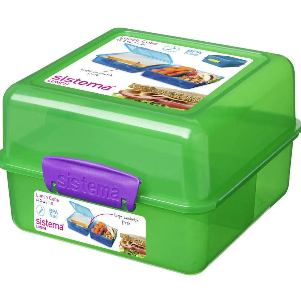 Fleur uw lunchtijd op met de kleurrijke Sistema® Lunch Cube, met een eenvoudige vergrendelingsclip, twee opslagniveaus en meerdere compartimenten om uw voedsel vers en gescheiden te bewaren tot je klaar bent om te eten. Het grote basiscompartiment is perfect voor het opbergen van uw broodje, terwijl de bovenste compartimenten zeer geschikt zijn voor snacks. Dit product is stapelbaar en veilig te gebruiken in de vaatwasser (op het bovenste rek), de magnetron (met het deksel open), of in de koelkast en de vriezer.