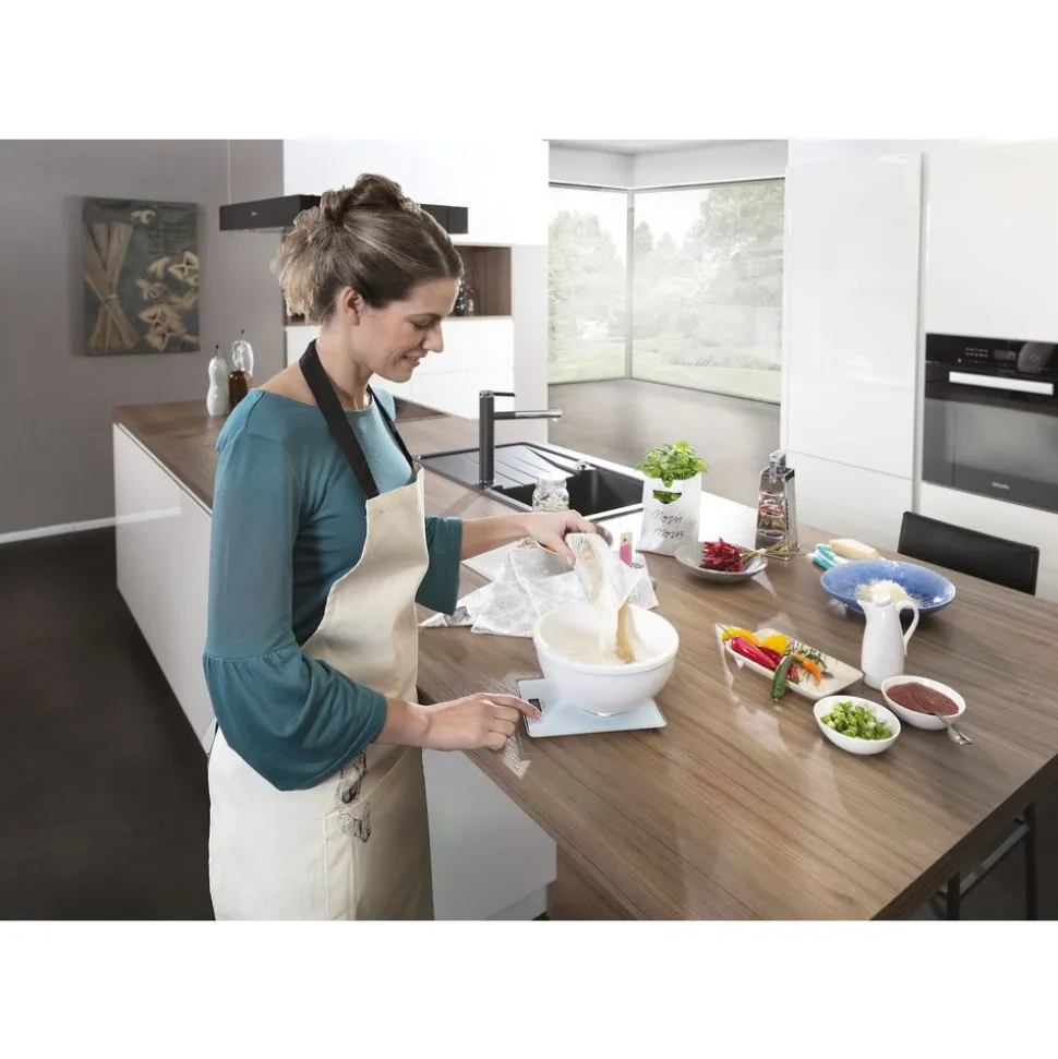 Wie ingrediënten zoals bloem, suiker of cacao wil afwegen, die kan de digitale keukenweegschaal Page Compact 300 in de Soehnle online shop kopen. Want deze heeft een draagvermogen van tot vijf kilogram en meet precies op 1 gram nauwkeurig – zo lukt gegarandeerd elk recept. Extra handig is de doorweegfunctie (tarra) van de kookweegschaal, dat maakt koken en bakken héél gemakkelijk. Deze maakt het mogelijk, verschillende ingrediënten in maar één schotel te kunnen wegen. Het gewicht is op de LCD display van de digitale weegschaal voor de keuken is goed leesbaar. Besturen laat zich de weegschaal voor de keuken héél comfortabel met de gepatenteerd sensor touch. De voordeel is, dat zich de groot weegoppervlak gemakkelijk laat reinigen. Omdat de batterijen deel van de levering zijn, kan de keukenweegschaal Page Compact 300 van Soehnle direct worden gebruikt. Vanzelfsprekend is het batterijvak vastgeschroefd en vervolgens kinderveilig. Omdat de digitale weegschaal voor de keuken een automatische uitschakelfunctie heeft, is ze héél energiebesparend. Ze heeft een batterijlevensduur van over twee jaar, als ze twee keer dagelijks gebruikt wordt. Dankzij het vlak design laat zich de bakweegschaal ruimtebesparend bewaren of met de ophanging aan de muur ophangen. Voor stabiliteit zorgen de antislip voetjes.