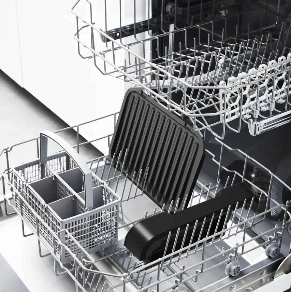 Vaatwasserbestendige antiaanbakplaten en vetopvangbakje voor moeiteloos schoonmaken.