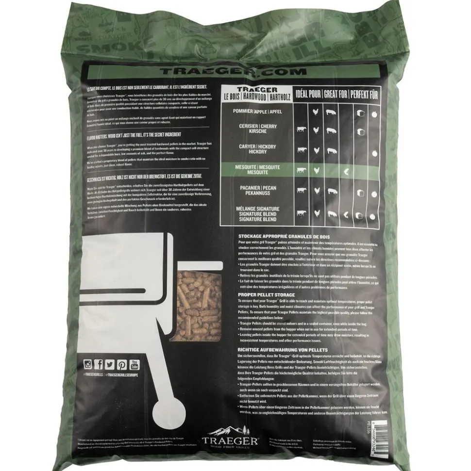 Traeger woodpellets… Kruidig en een aardachtig aroma. Goed met rundsvlees, vis en kip. De rook is wrang tot bitter naargelang men het langer laat roken. Niet iedereen geniet van de smaak van mesquite. Men adviseert om mesquite te gebruiken voor het grillen en roken.