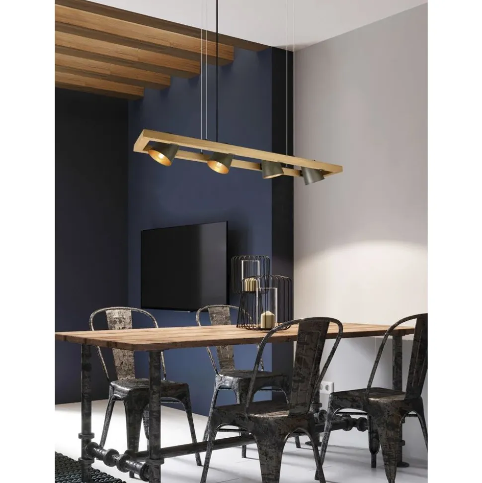 Een harmonisch totaalbeeld! De moderne vintagestijl uit hout en metaal maakt van de pendellamp BELL een decoratieve blikvanger. Boven de eettafel zorgt de lamp voor een aangename verlichting en wordt een echte blikvanger. Haar opvallende spots kunnen bovendien flexibel gericht worden. De kappen in antiek nikkel en goud ronden de moderne woonstijl vakkundig af. Voor een energiebesparende verlichting is het gebruik van een ledlichtbron aanbevolen. Deze zijn een optimaal alternatief voor gewone halogeenlampen en staan voor een hoge lichtkwaliteit en een energiebesparing van tot 80%. Bovendien profiteert u bij ledlichtbronnen van een lange levensduur, een geringe warmteontwikkeling en spaart tegelijkertijd het milieu.