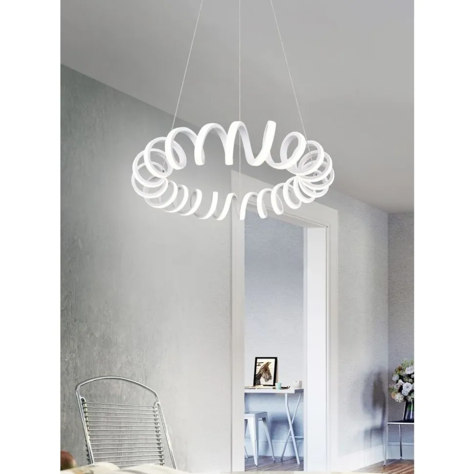 De hanglamp CURL wordt door haar buitengewoon design het middelpunt van uw woonruimte. Als centraal element boven de eettafel, in de woonkamer of op de gang wordt de lamp een absolute blikvanger en zorgt tegelijkertijd voor aangenaam licht. Daarnaast beschikt de lamp over een SWITCH-dimmer waardoor de helderheid in niveaus afgestemd kan worden van 100% naar 50% en 25% door middel van een gewone lichtschakelaar. Het moderne kleurschema in mat wit maakt een eenvoudige combinatie met aanwezige kleurconcepten mogelijk. Daarnaast beschikt de lamp over een moderne ledtechnologie die zich onderscheidt met een hoge lichtkwaliteit en energie-efficiëntie. In vergelijking met gewone halogeenlampen kan tot 80% bespaard worden op de energiekosten. Bovendien hebben ledlampen een lange levensduur, produceren minder warmte en zijn milieuvriendelijk.