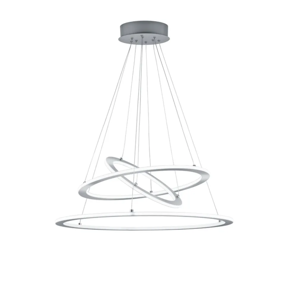 Zet stijlvolle accenten met de moderne hanglamp DURBAN. Het elegante design van de lamp trekt alle blikken op zich en optimaliseert de moderne woonstijl. Via de geïntegreerde SWITCH-dimmer kunnen door middel van een gewone lichtschakelaar drie verschillende helderheidsniveaus gekozen worden. Door de lichtintensiteit te verminderen van 100% naar 50% en 25% kan de lamp aangepast worden aan verschillende behoeften. De hanglamp bestaat uit drie ringen, de onderste ringt heeft een diameter van 80 cm, bij de beide in elkaar hangende ringen heeft de buitenste ring een diameter van 60 cm en de binnenste van 40 cm. De kleur in mat nikkel laat daarnaast veel speelruimte bij de combinatie met al aanwezige interieur en kleuren. Daarnaast beschikt de lamp over een moderne ledtechnologie die zich onderscheidt met een hoge lichtkwaliteit en energie-efficiëntie. In vergelijking met gewone halogeenlampen kan tot 80% bespaard worden op de energiekosten. Bovendien hebben ledlampen een lange levensduur, produceren minder warmte en zijn milieuvriendelijk.