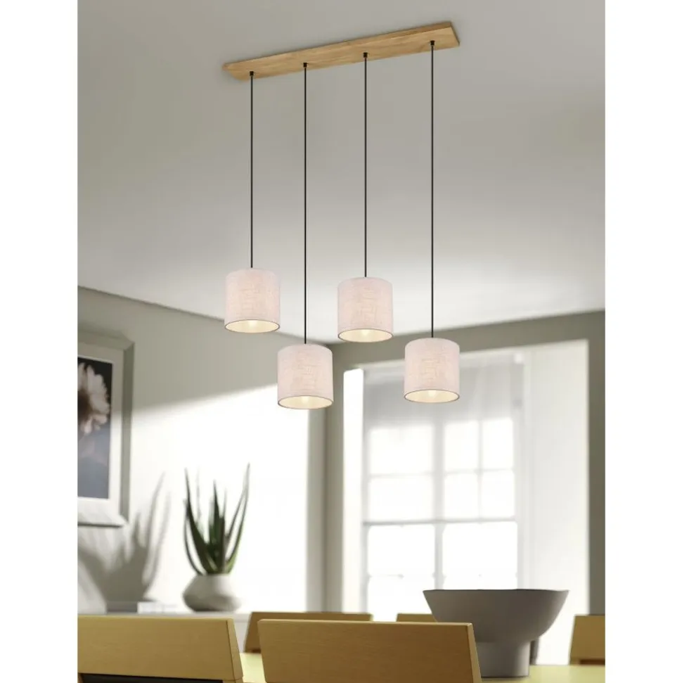 Natuurlijke materialen, zoals hout en stof, werken uitnodigend en creƫren een behaaglijke sfeer. De lampen van de serie ELMAU brengen een gezellige charme en een aangename lichtstemming uw huis binnen. Op de gang of in de woon- of slaapkamer, die lamp biedt veelzijdige toepassingsgebieden. De viervlammige hanglamp heeft een maximale hanglengte van 150 cm. De aparte lampenkappen hebben een diameter van 35 cm en de hoogte ervan kan individueel afgesteld worden. Het lichte design uit hout en beige stof laat zich gemakkelijk combineren met verschillende kleur- en inrichtingsconcepten. Voor een energiebesparende verlichting is het gebruik van een ledlichtbron aanbevolen. Deze zijn een optimaal alternatief voor gewone halogeenlampen en staan voor een hoge lichtkwaliteit en een energiebesparing van tot 80%. Bovendien profiteert u bij ledlichtbronnen van een lange levensduur, een geringe warmteontwikkeling en spaart tegelijkertijd het milieu.