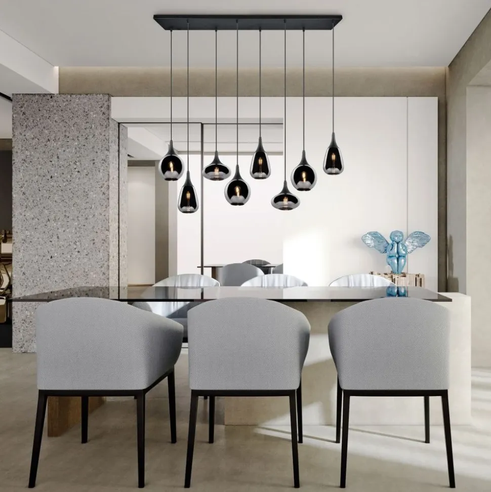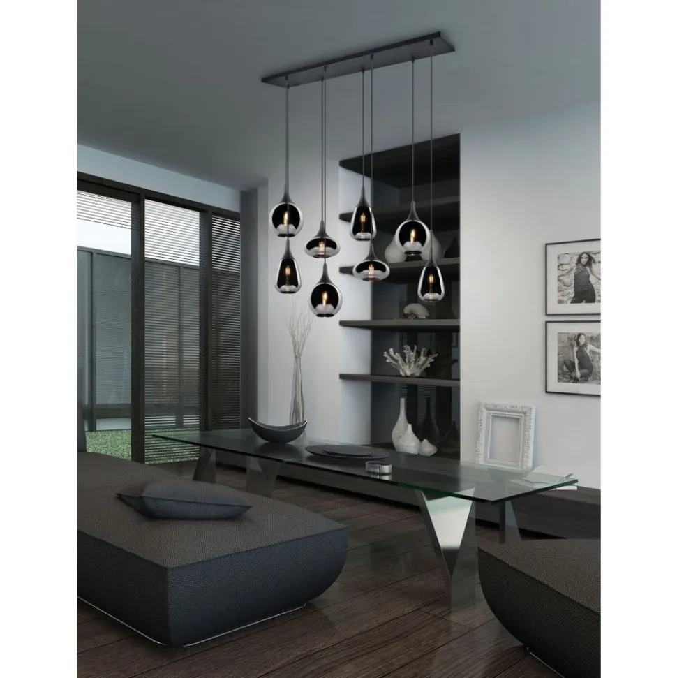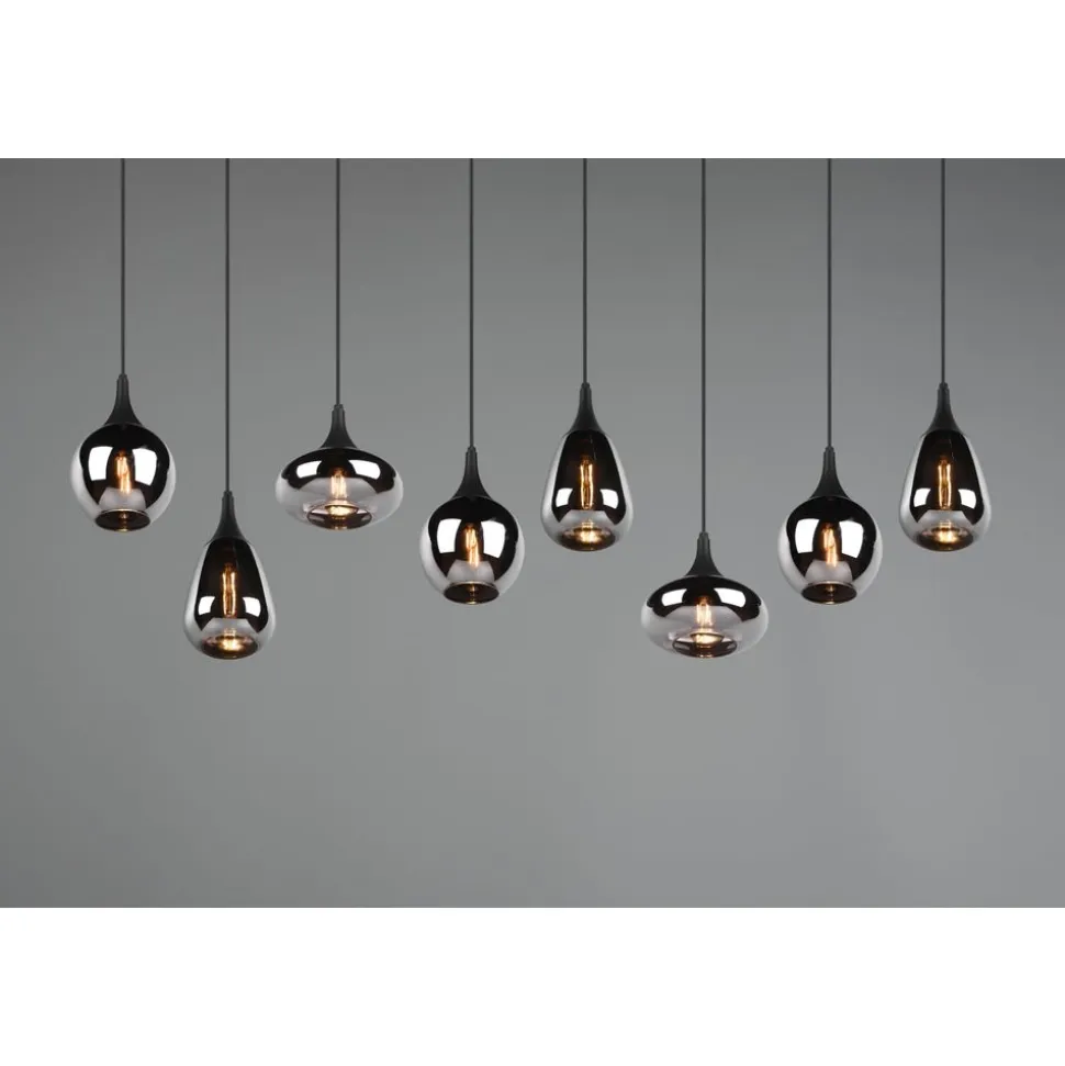 De hanglamp LUMINA is door de elegante glazen kappen een bijzondere blikvanger in uw woonruimte! De verschillende vormen van de acht kappen en de compositie van metaal en glas zorgen voor een mooie en unieke lichtsfeer en geven een moderne toets aan uw eetzone. Dankzij het kleurschema in mat zwart en de bedampte chromen glazen kappen is er veel ruimte voor extra tinten, waardoor de lamp wonderbaarlijk eenvoudig te integreren is in bestaande woonconcepten. Voor een energiebesparende verlichting is het gebruik van een ledlichtbron aanbevolen. Deze zijn een optimaal alternatief voor gewone halogeenlampen en staan voor een hoge lichtkwaliteit en een energiebesparing van tot 80%. Bovendien profiteert u bij ledlichtbronnen van een lange levensduur, een geringe warmteontwikkeling en spaart tegelijkertijd het milieu.
