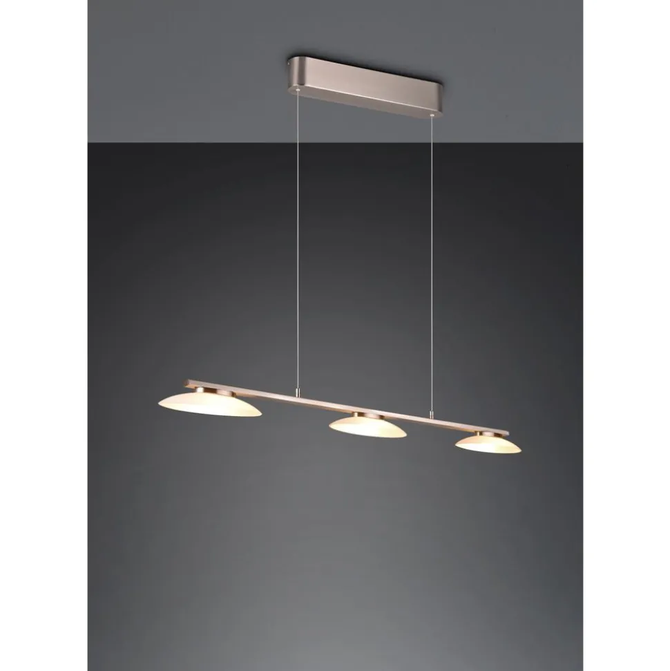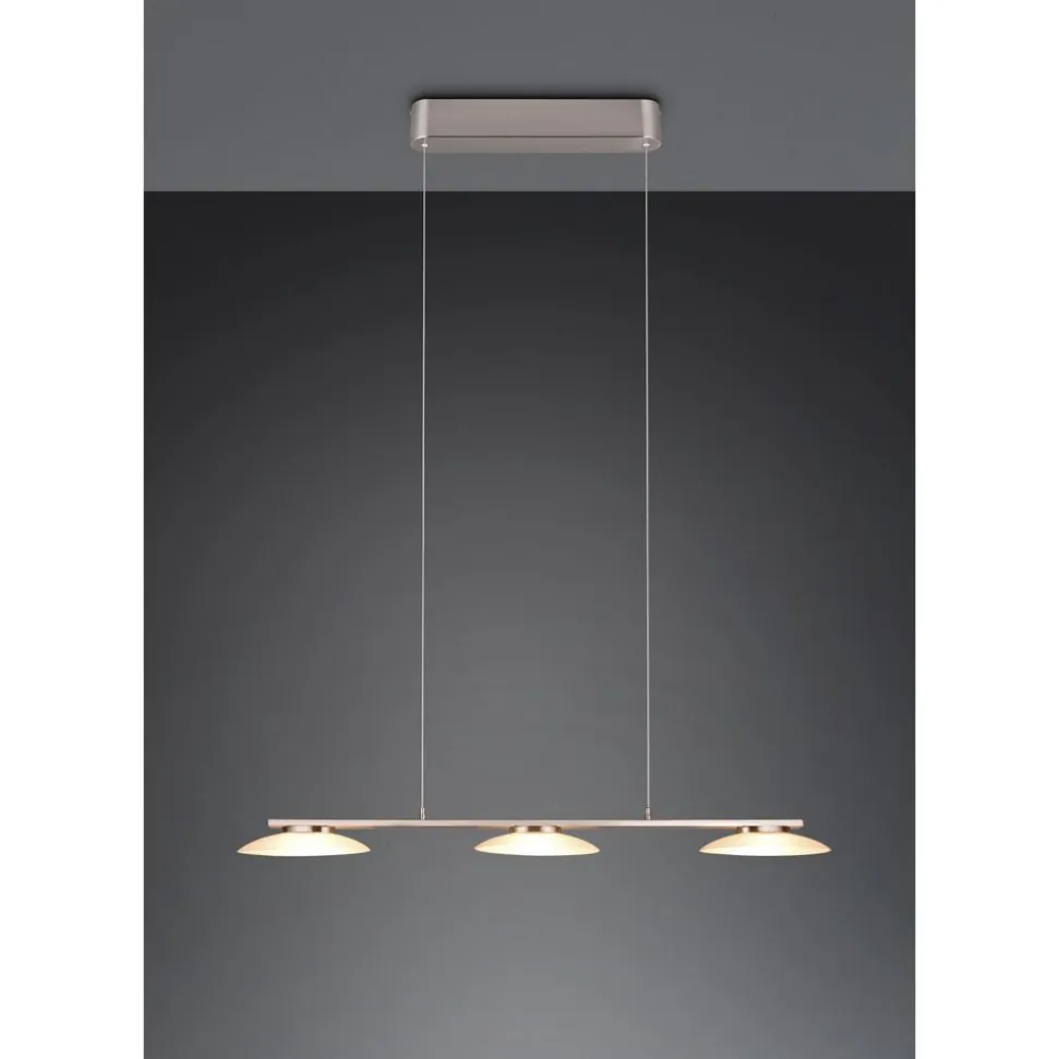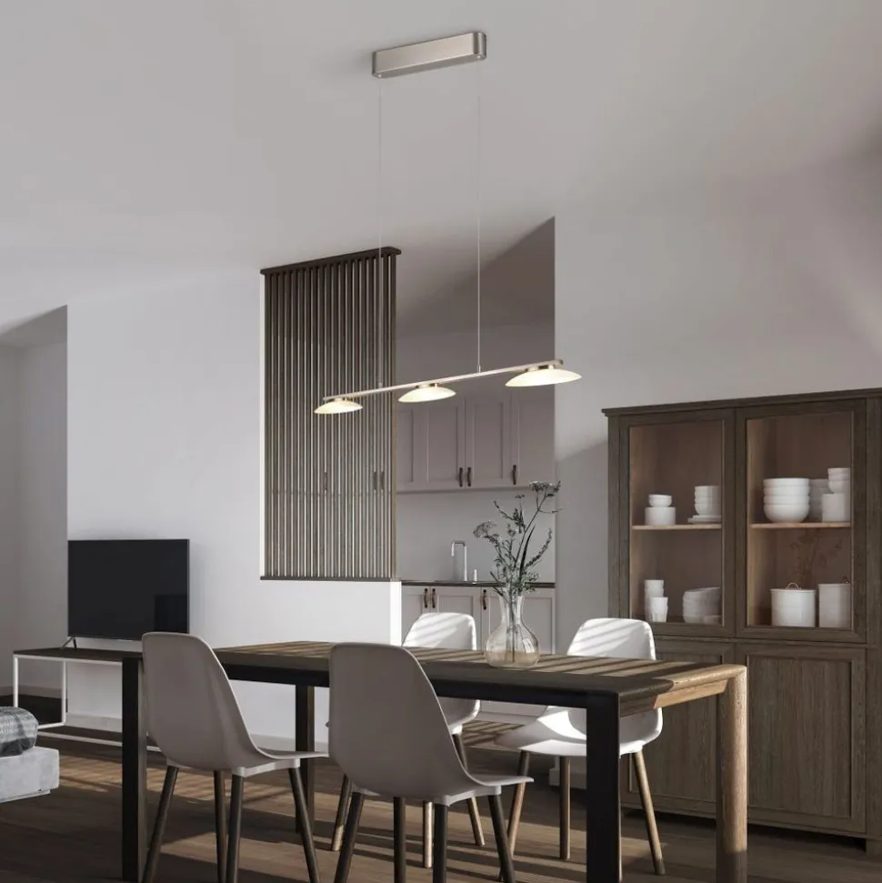 Nikkelkleurige lampen met glas kunnen op verschillende manieren worden gebruikt en geven blijk van een geraffineerde touch – net als de minimalistische, tijdloze MERTON hanglamp. De drie glazen elementen verspreiden het licht zachtjes in hun omgeving, waardoor de armatuur een geschikte lichtbron is boven een eettafel of aanrecht. Met de geïntegreerde SWITCH-dimmer kan de lichtsterkte bovendien in drie stappen (100%, 50%, 25%) worden aangepast met een conventionele lichtschakelaar. Laat je eettafel stralen als centraal element in de eethoek! De hanglamp creëert een harmonieus geheel dankzij het witte glas en het metaal in mat nikkel. De armatuur is ook voorzien van moderne LED-technologie, die wordt gekenmerkt door een hoge lichtkwaliteit en energie-efficiëntie. Vergeleken met conventionele halogeenlichtbronnen kan tot 80% op de energiekosten worden bespaard. Met LED lichtbronnen profiteert u ook van een lange levensduur en een lage warmteontwikkeling, terwijl het milieu wordt beschermd.