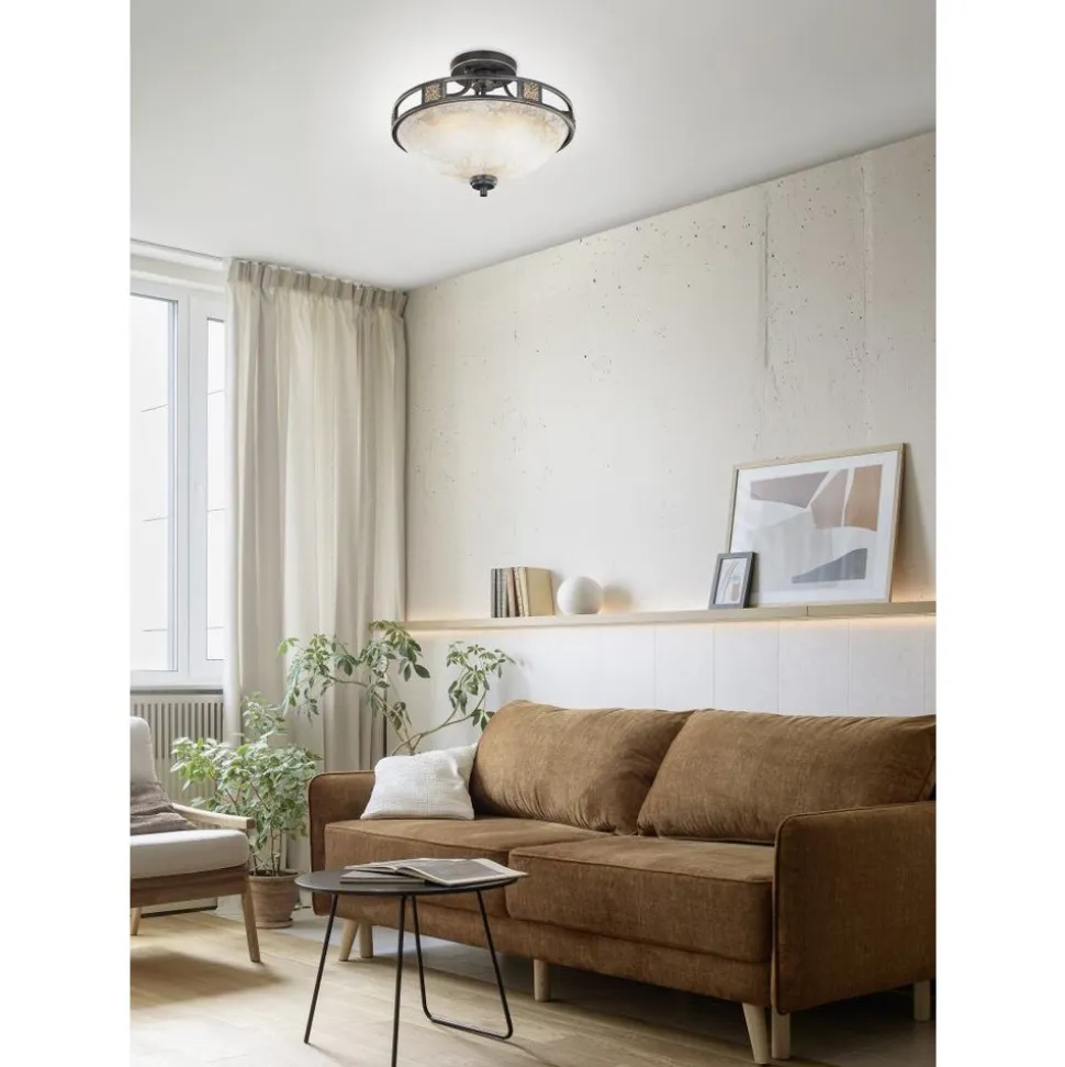 Rustiek design gecombineerd met antiek geïnspireerde materialen creëren de QUINTA plafondlamp in typische landhuisstijl. Het klassieke uiterlijk van deze plafondlamp benadrukt zowel rustieke als mediterrane inrichtingsstijlen. Met haar zachte, niet-verblindende licht geeft ze kamers een gezellige sfeer. De diameter is 42 cm. Het frame met roestkleurig oppervlak wordt aantrekkelijk geaccentueerd door goudkleurige ornamenten. Het champagnekleurige, licht gestructureerde glas zorgt voor een bijzonder warme gloed. Voor een energiebesparende verlichting is het gebruik van een ledlichtbron aanbevolen. Deze zijn een optimaal alternatief voor gewone halogeenlampen en staan voor een hoge lichtkwaliteit en een energiebesparing van tot 80%. Bovendien profiteert u bij ledlichtbronnen van een lange levensduur, een geringe warmteontwikkeling en spaart tegelijkertijd het milieu.