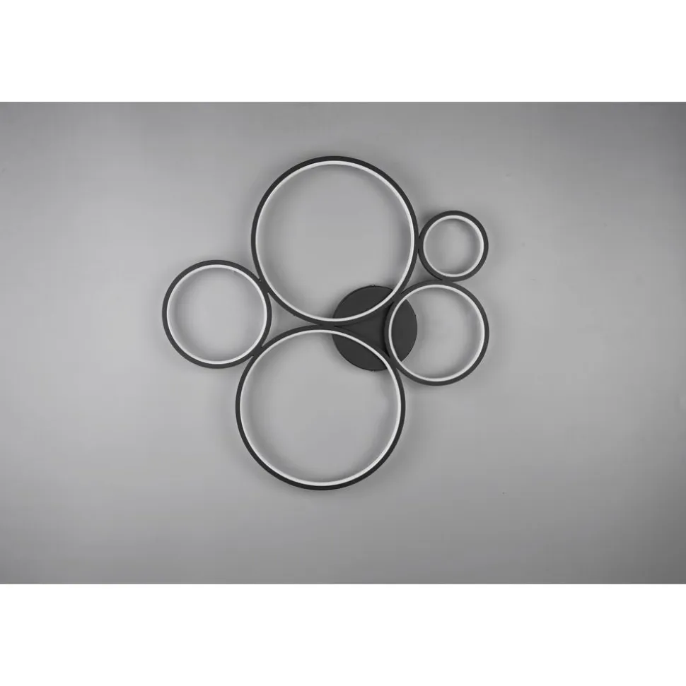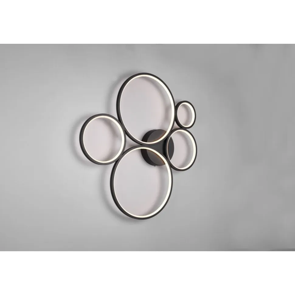 Met haar vijf aan elkaar hangende ringen met een verschillende diameter is de plafondlamp RONDO een echte blikvanger. De plafondlamp beschikt over een geïntegreerde SWITCH-dimmer die via een lichtschakelaar bediend wordt. Zo kan de helderheid van de in de binnenste kringen ingebouwde leds in drie niveaus geregeld worden via de lichtschakelaar. De plafondlamp is een echt decoratie-element en verfraait elke woonruimte op stijlvolle wijze. Dankzij de mat zwarte kleur kan de lamp met vele inrichtingsstijlen gecombineerd worden. Voor een energiebesparende verlichting is het gebruik van een ledlichtbron aanbevolen. Deze zijn een optimaal alternatief voor gewone halogeenlampen en staan voor een hoge lichtkwaliteit en een energiebesparing van tot 80%. Bovendien profiteert u bij ledlichtbronnen van een lange levensduur, een geringe warmteontwikkeling en spaart tegelijkertijd het milieu.