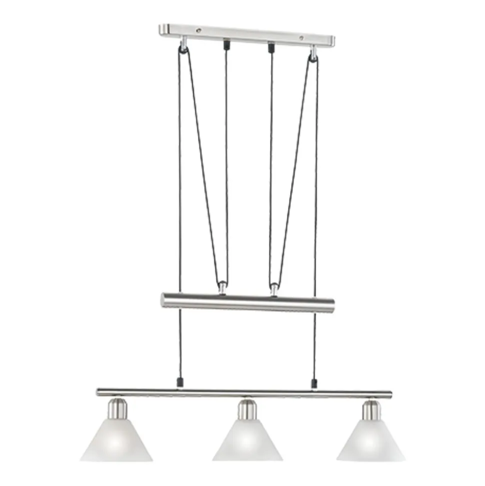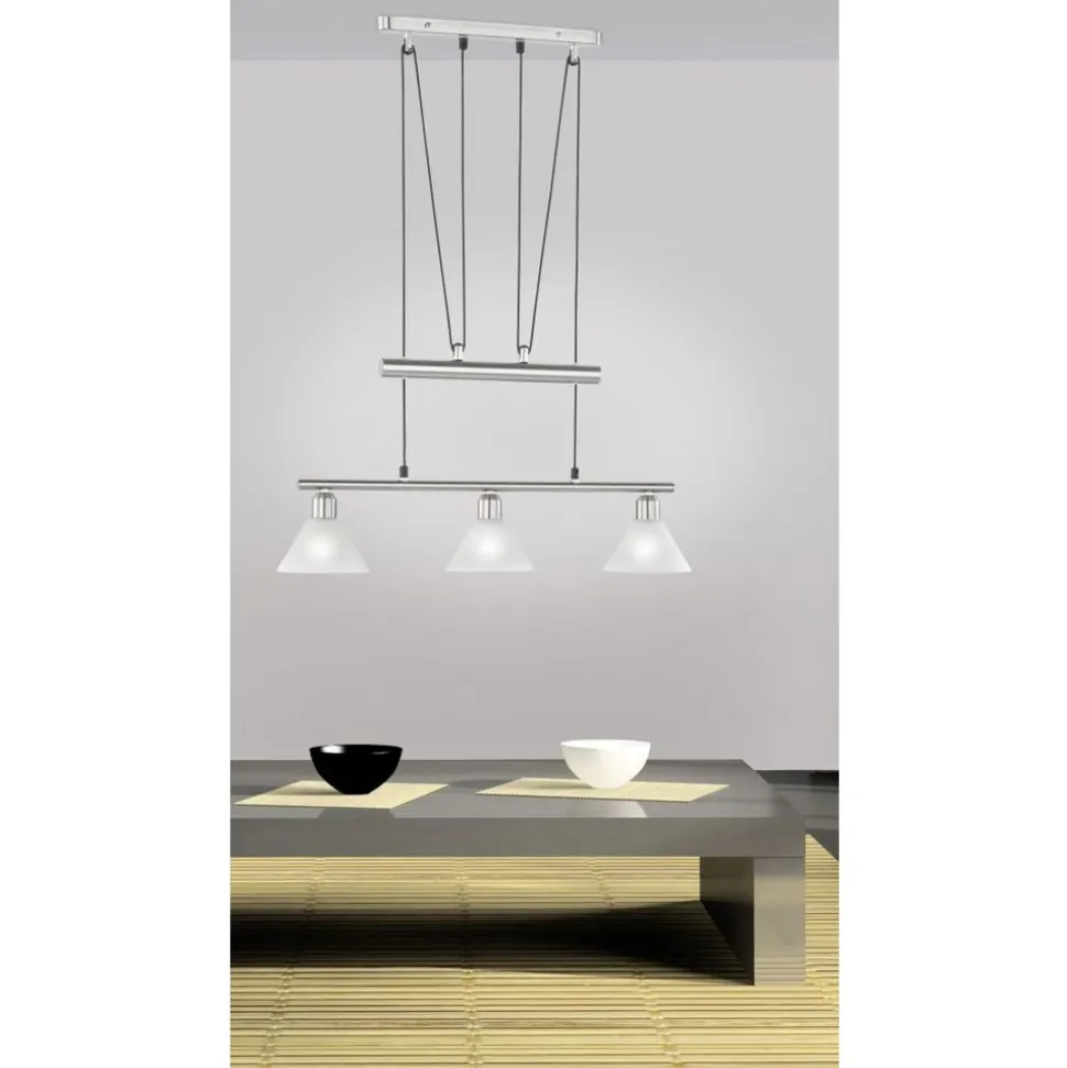 De in hoogte verstelbare STAMINA lamp zorgt met zijn licht voor een aangename verlichting in je woonruimte en is bijzonder geschikt voor gebruik boven de eettafel of iets dergelijks. De breedte is 66cm en de hoogte is verstelbaar van 80 tot 180cm. Het aantrekkelijke silhouet samen met het frame in mat nikkel en de glazen lampenkappen in opaalwit creëren een elegante look. Voor een energiebesparende verlichting is het gebruik van een ledlichtbron aanbevolen. Deze zijn een optimaal alternatief voor gewone halogeenlampen en staan voor een hoge lichtkwaliteit en een energiebesparing van tot 80%. Bovendien profiteert u bij ledlichtbronnen van een lange levensduur, een geringe warmteontwikkeling en spaart tegelijkertijd het milieu.
