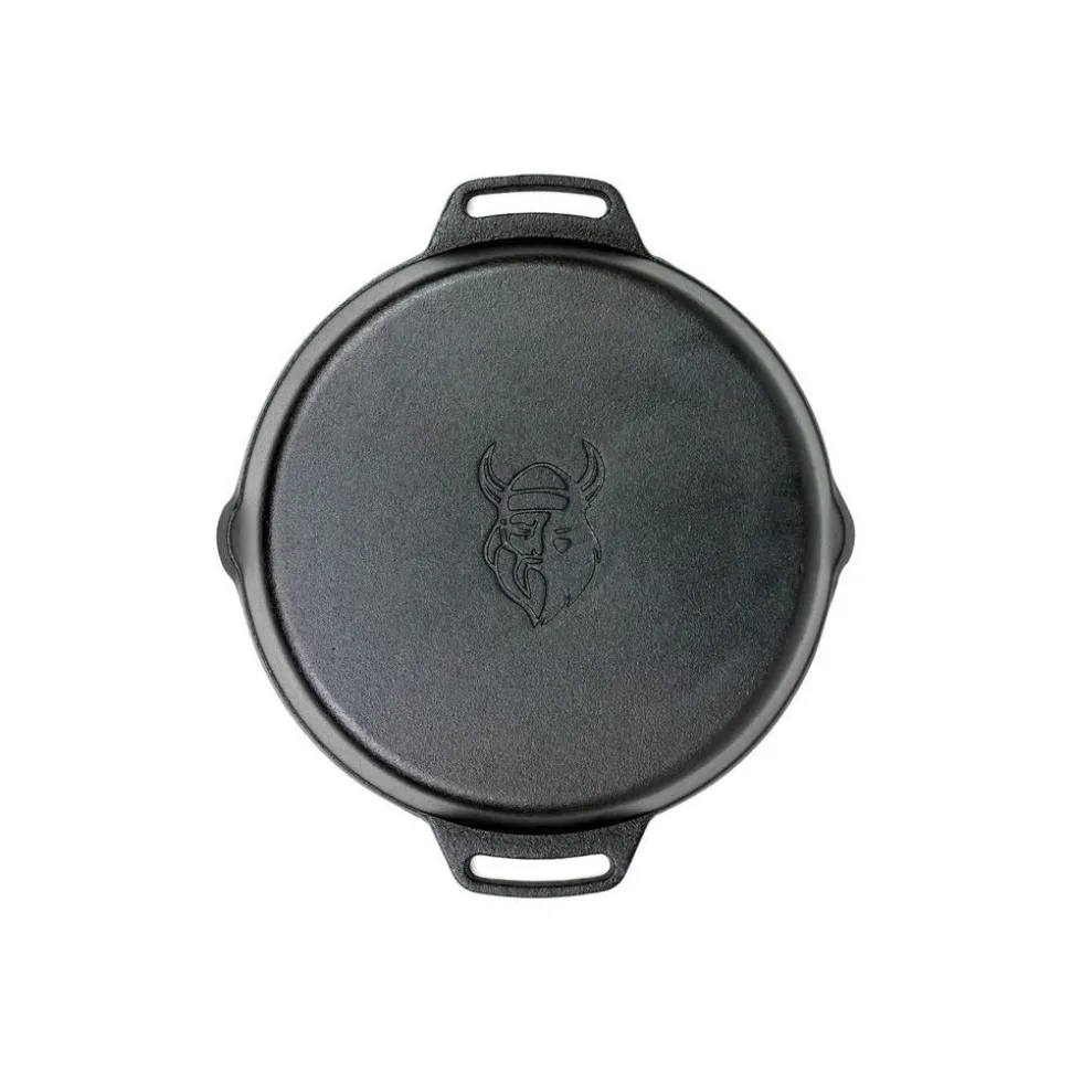 De VH30H skillet van Valhal Outdoor heeft een diameter van 30cm én heeft twee handvatten. De skillet heeft ook aan beide zijdes schenktuiten om bijvoorbeeld sauzen makkelijk uit te kunnen schenken. Doordat de skillet in zijn geheel van gietijzer gemaakt is, is deze geschikt voor alle warmtebronnen. Je kan er dus mee koken op je fornuis binnen, maar net zo goed op een kampvuur in je tuin of in de natuur. Deze skillet is geliefd onder bbq-ers met een keramische bbq of Weber.