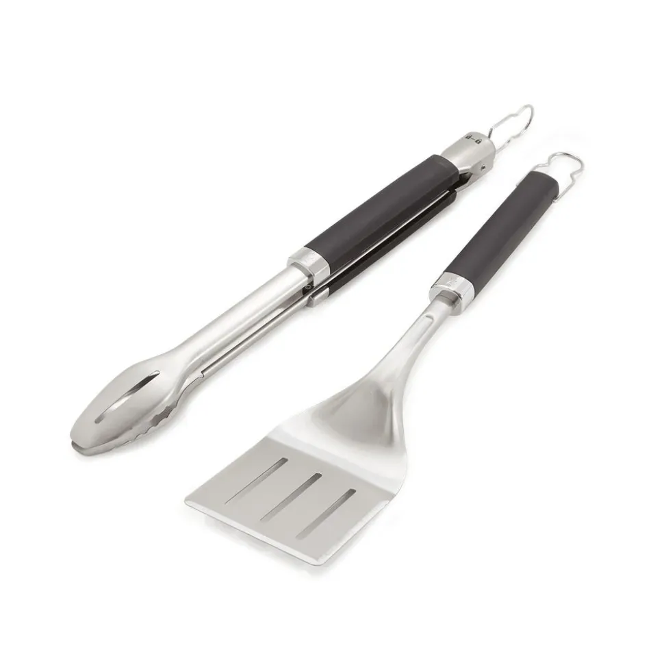 De Precision barbecuetang- en spatelset is ontworpen om prestaties te leveren. Beide hebben een duurzame roestvrijstalen constructie en zachte handgreep voor comfort en controle. De tang met handsfree vergrendeling heeft een platte voorkant voor een zekere grip wanneer je delicaat voedsel optilt en keert. De spatel heeft een 3-zijdige afgeschuinde rand die gemakkelijk onder het eten glijdt. Beide gereedschappen zijn vaatwasserbestendig.