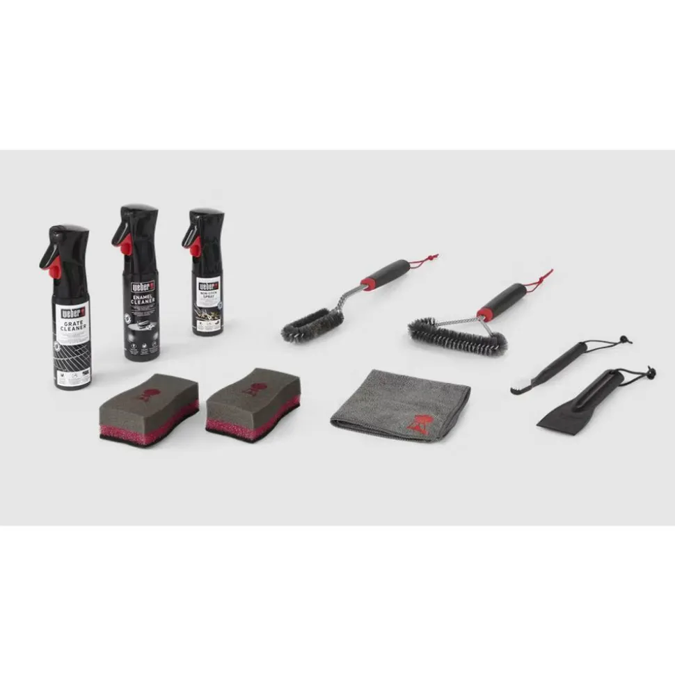 Wanneer u goed voor uw barbecue zorgt, blijft deze er als nieuw uitzien en goede resultaten leveren, seizoen na seizoen. Wanneer u uw barbecue af en toe aan een grondige schoonmaakbeurt onderwerpt, blijft deze er niet alleen fantastisch uitzien, maar zorgt u ook voor een veilige werking en optimale warmteverdeling. Met de speciaal voor emaillen Weber® gasbarbecues gemaakte reinigingsset hebt u alle tools in handen om uw barbecue er goed uit te laten blijven zien en geweldig te laten werken. Bevat borstels, schoonmaakproducten, een spons, doek en anti-aanbakspray.