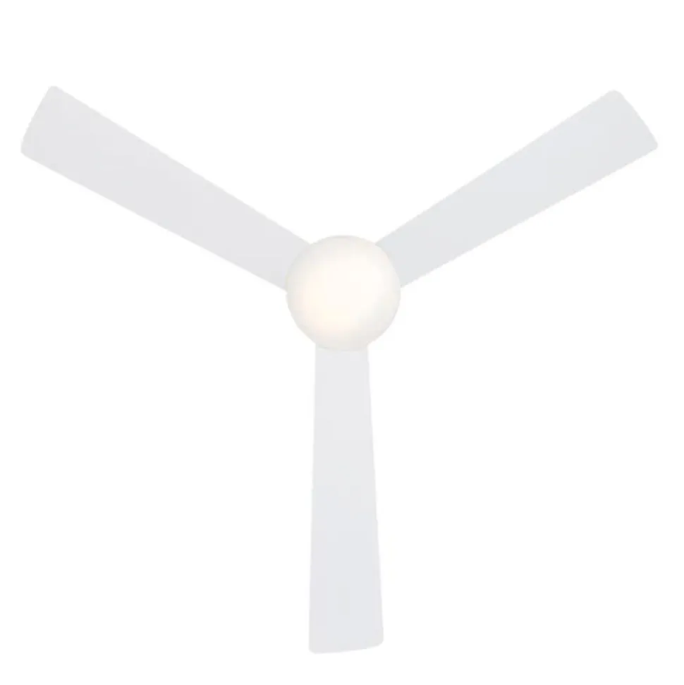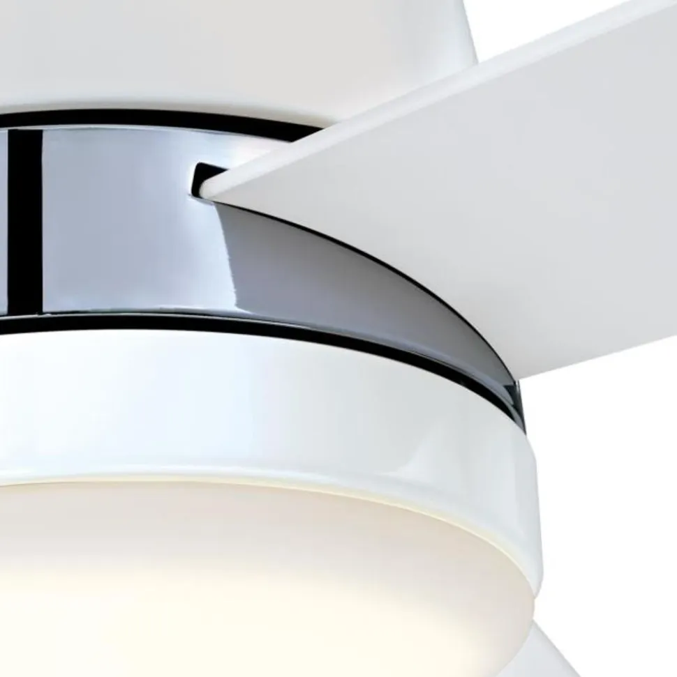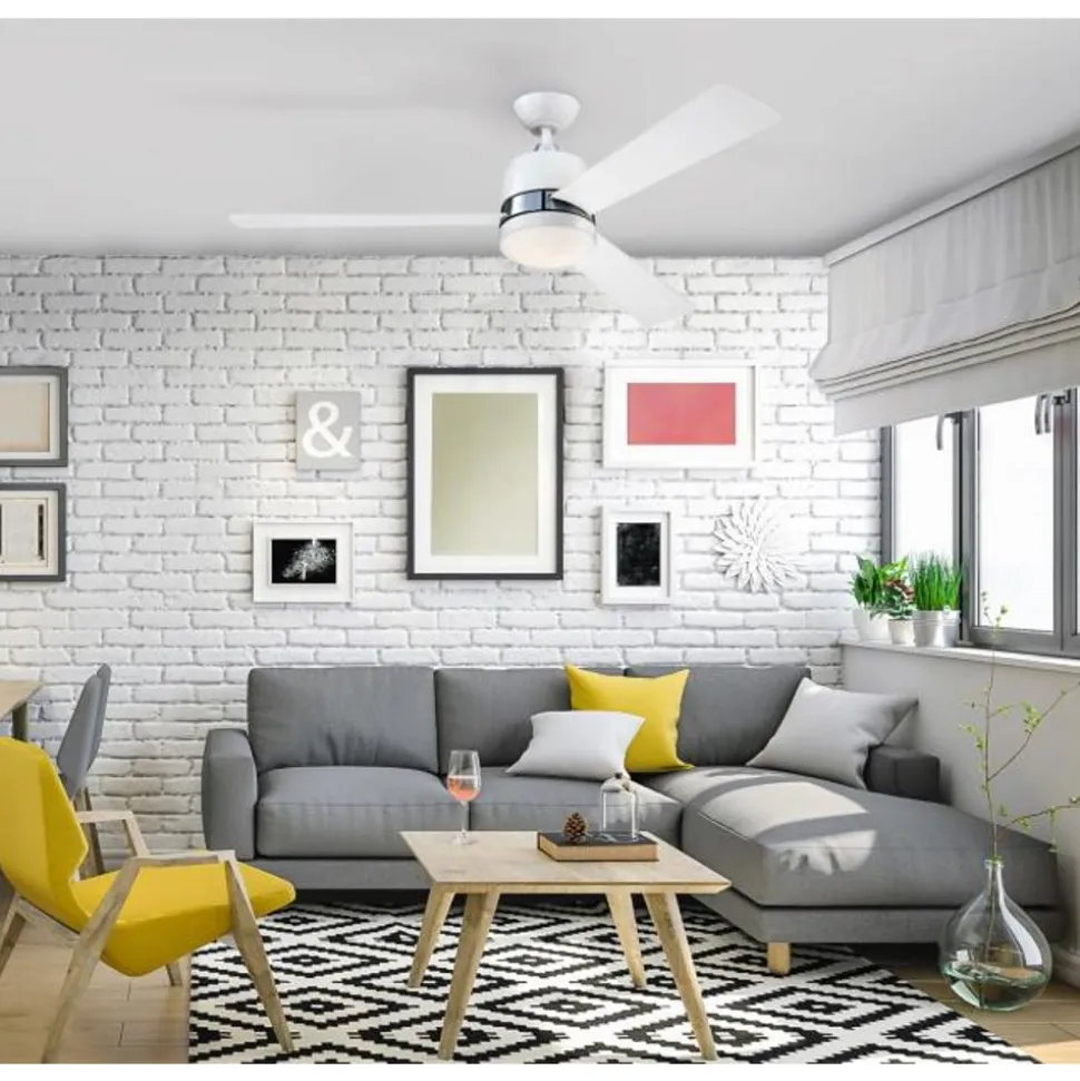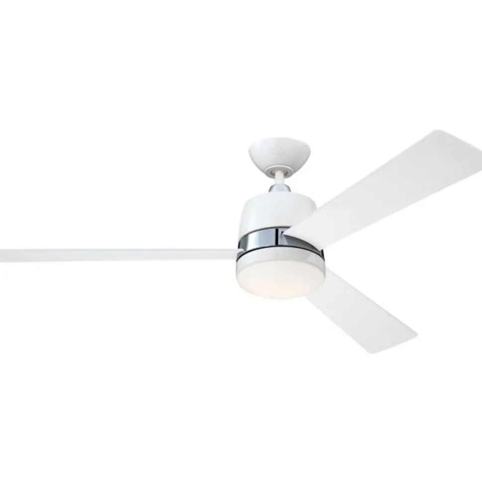 De Tristan 132 cm plafondventilator met licht en afstandsbediening heeft een tweekleurige afwerking van wit met accenten van geborsteld nikkel. Met drie omkeerbare bladen in bijpassende afwerkingen van wit en licht esdoorn, is de Tristan een opvallende verbetering voor het moderne huis.