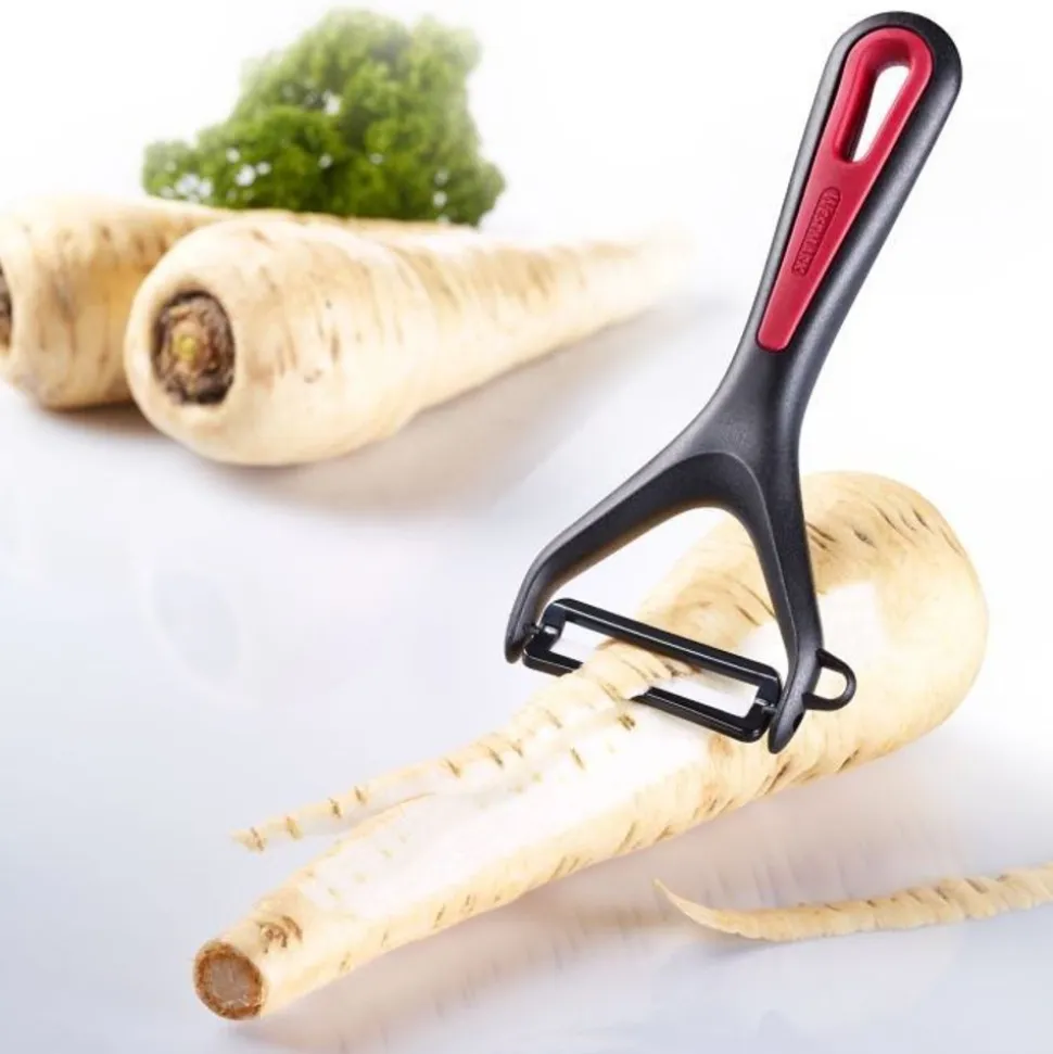 De groente- en aspergeschiller “Gallant” heeft een beweegbaar en bijzonder scherp keramisch mes. Het is geschikt voor het schillen van ronde of langwerpige groenten en fruit zoals asperges, komkommer, aardappelen en appels. Het beweegbare mes past zich perfect aan alle contouren aan en de snijder helpt bij het verwijderen van beschadigde plekken en lelijke vlekken. Dankzij de speciale comfortabele soft-touch handgreep ligt de dunschiller perfect in de hand en dankzij de ophanglus kan hij ruimtebesparend worden opgeborgen.