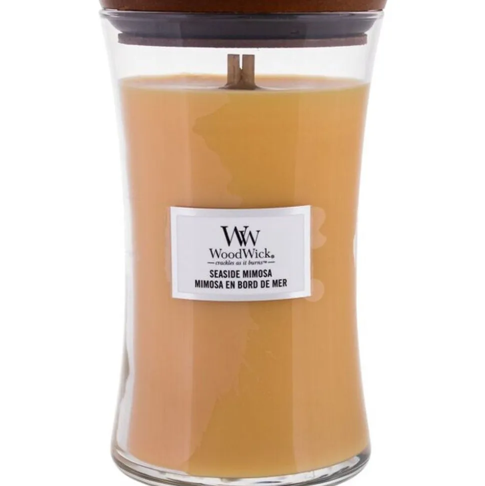 De grote Woodwick kaars met de geur Seaside mimosa neemt je mee naar een zomers strand. De geur mix van sappige citrus en champagne druiven doet je denken aan een heerlijk verfrissend drankje op het strand. Deze kaars is de grootste Woodwick kaars die is voorzien van het stijlvolle glas en houten deksel. Met deze kaars beleef je deze geur het langst, minimaal 130 branduren heeft deze kaars.