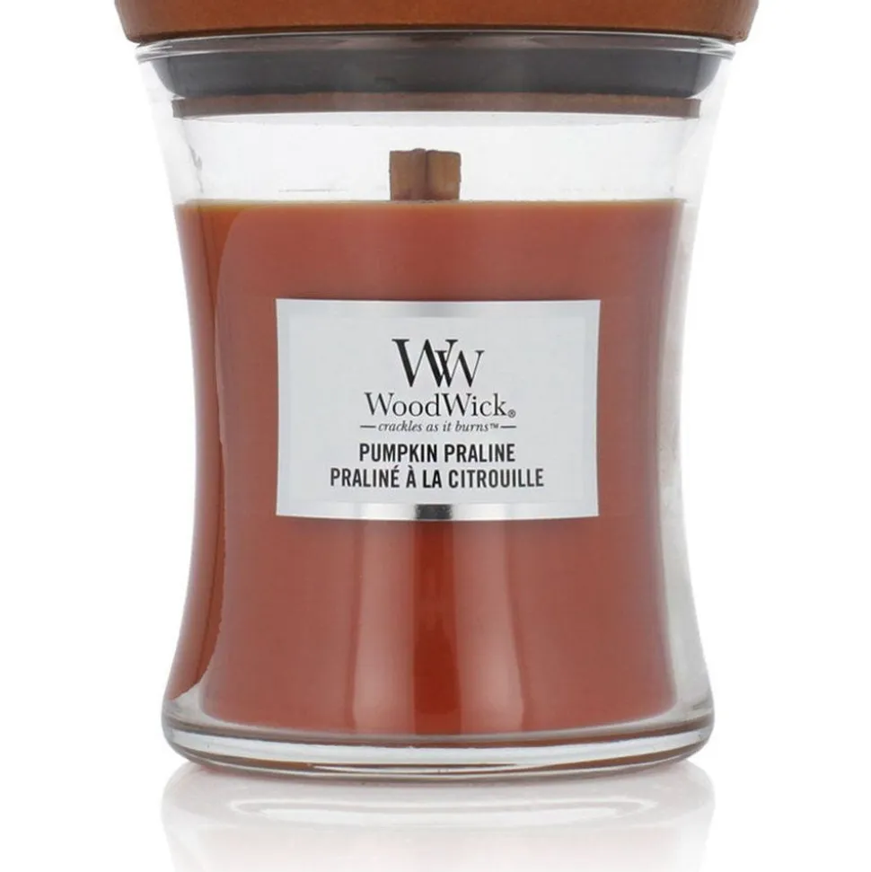 De WoodWick Hourglass Medium geurkaars – Pumpkin Praline heeft een heerlijke geur van pompoen gezoet met ahorn en gekruid met gember en nootmuskaat.