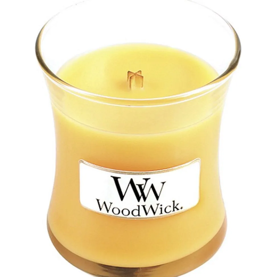 De mini Woodwick kaars met de geur Seaside mimosa neemt je mee naar een zomers strand. De geur mix van sappige citrus en champagne druiven doet je denken aan een heerlijk verfrissend drankje op het strand. Deze kaars is de kleinste Woodwick kaars die is voorzien van het stijlvolle glas en houten deksel. Deze kaars geeft je minimaal 20 uur lang het plezier van deze heerlijke geur.