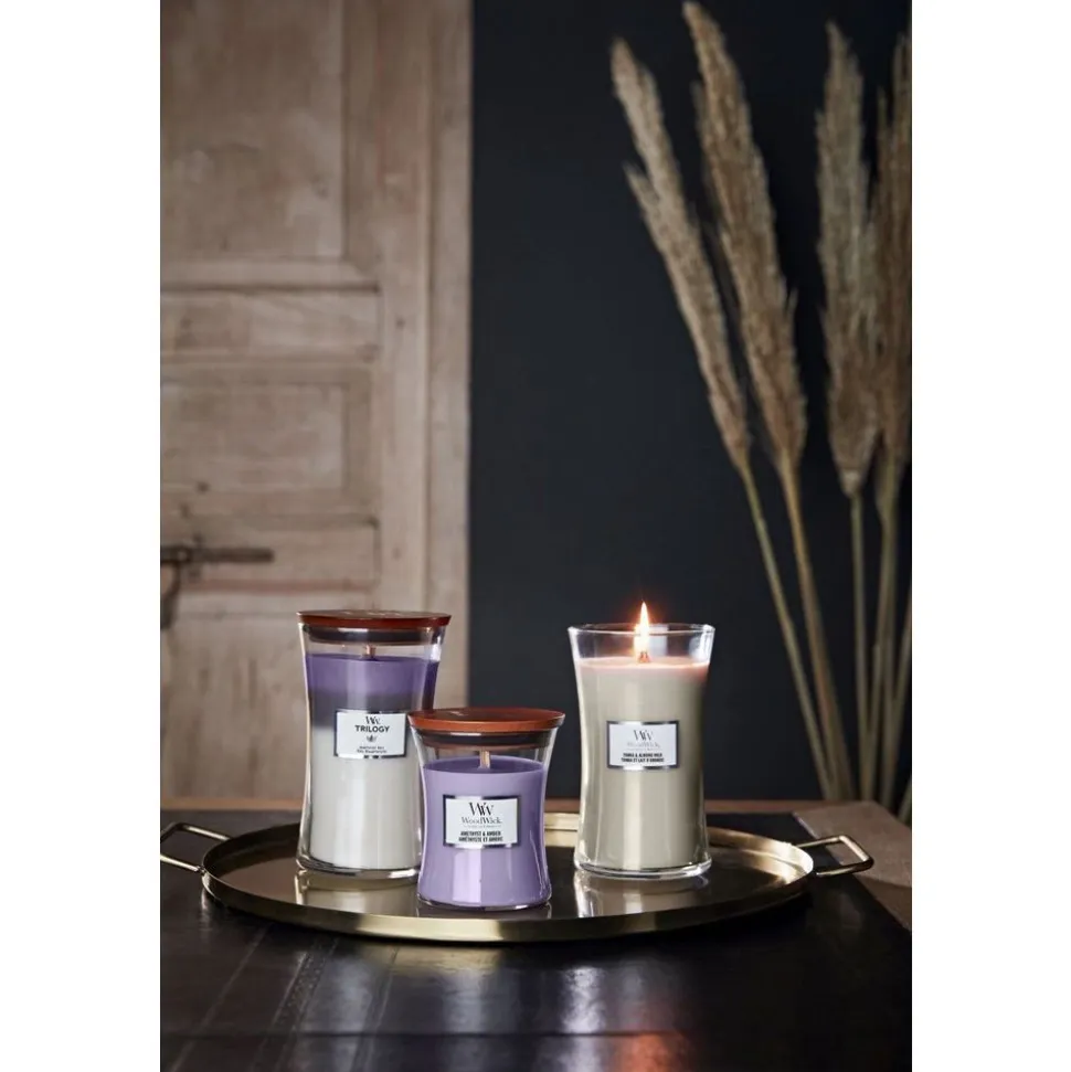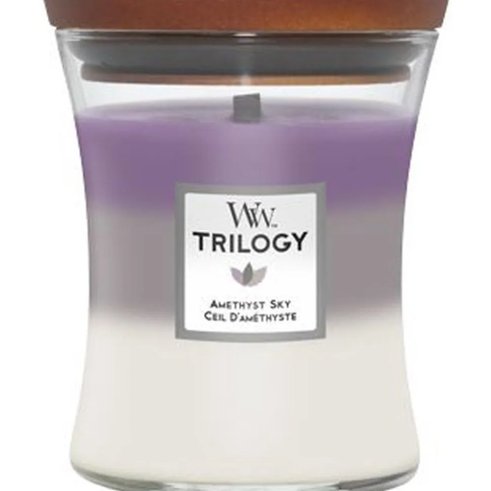 De WoodWick Amethyst Sky Geurkaars is een bloemige geur. De geurkaars heeft een ronde vorm als een zandloper en een houten deksel. De kaars heeft een houten lont die knettert als je hem aansteekt.