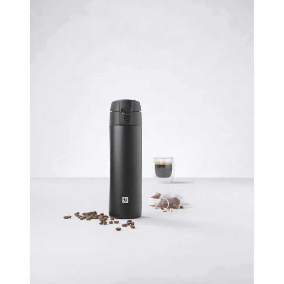 De Thermo Travel Bottle is ideaal om koffie, thee of koude dranken mee te nemen naar het werk, op autoritten of naar sportevenementen. Warme dranken blijven tot 7 uur warm, terwijl koude dranken tot 12 uur koud blijven. Het met één druk op de knop te openen deksel is gemaakt voor bediening met één hand, met een veiligheidsvergrendeling om onbedoeld openen te voorkomen. En de antislipbodem voorkomt morsen tijdens het vullen. Het afneembare deksel maakt het opruimen een makkie, vooral wanneer het in de vaatwasser wordt gegooid. Deze aantrekkelijke fles is verkrijgbaar in zilverwit en mat zwart en is een stijlvolle manier om drankjes mee te nemen.