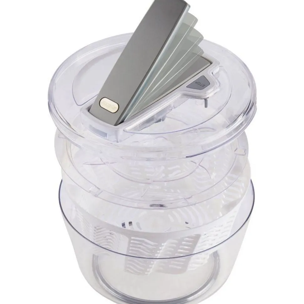 De Swift-dry slacentrifuge van Zyliss met nieuwe Aquavent technologie en gebrevetteerd vergiet verwijdert 25% meer water dan een klassieke slacentrifuge. Met één druk op de pomphendel activeer je het draaimechanisme. De luchttoevoer via de openingen in het deksel en de bodem van de mand zorgen voor het efficiënt afvoeren van het overtollige water. De stopknop met remfunctie houdt de sla luchtig.